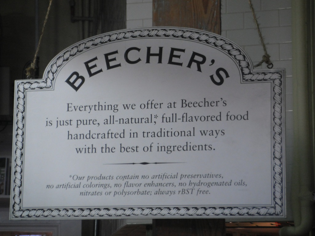 I couldn’t remember the name of the place but I remembered the location. As I briskly walked, unsuccessfully trying to avoid the raindrops as I swerved back and forth down the sidewalk, I saw the store ahead…Beecher’s Handmade Cheese.
