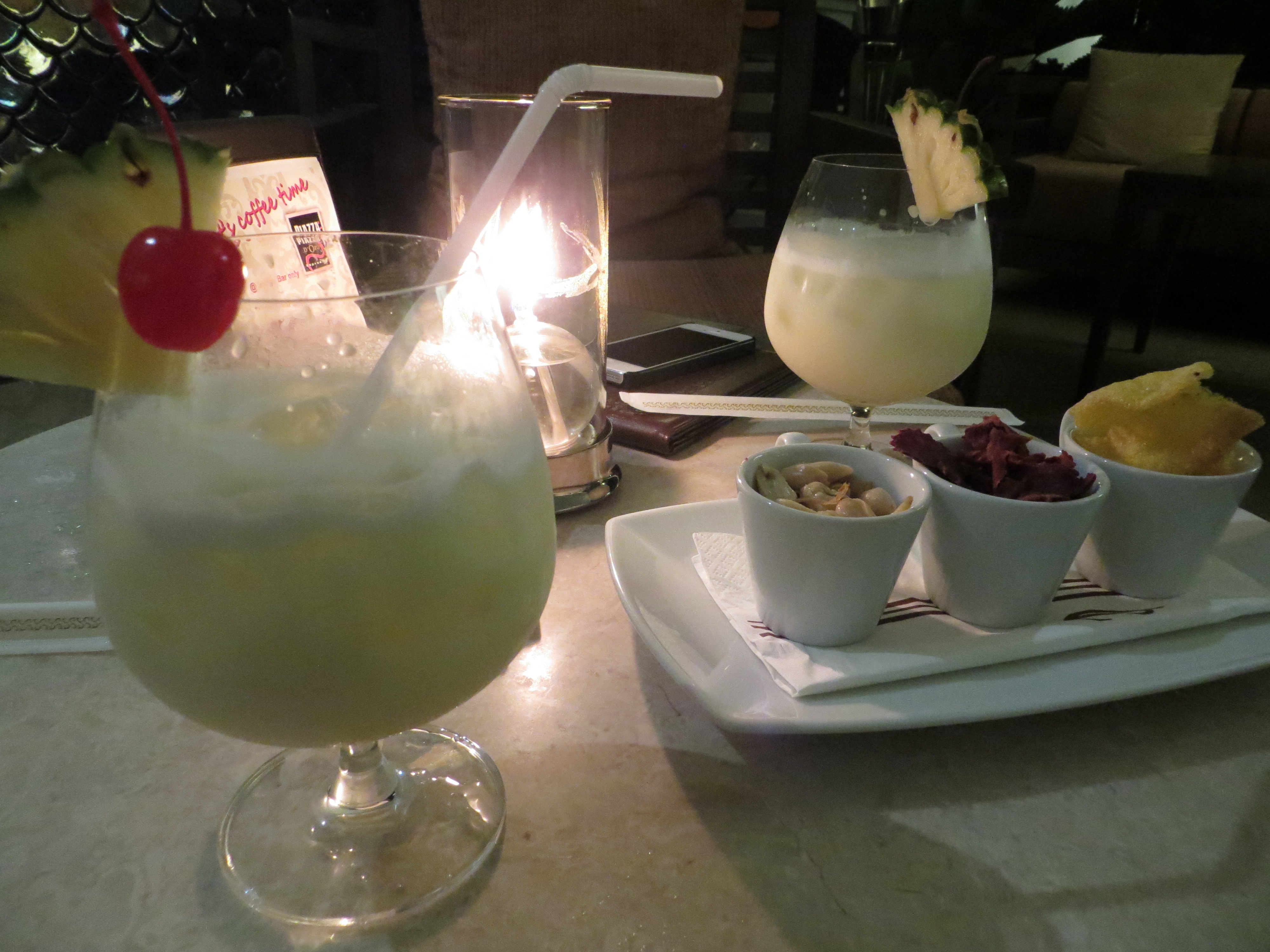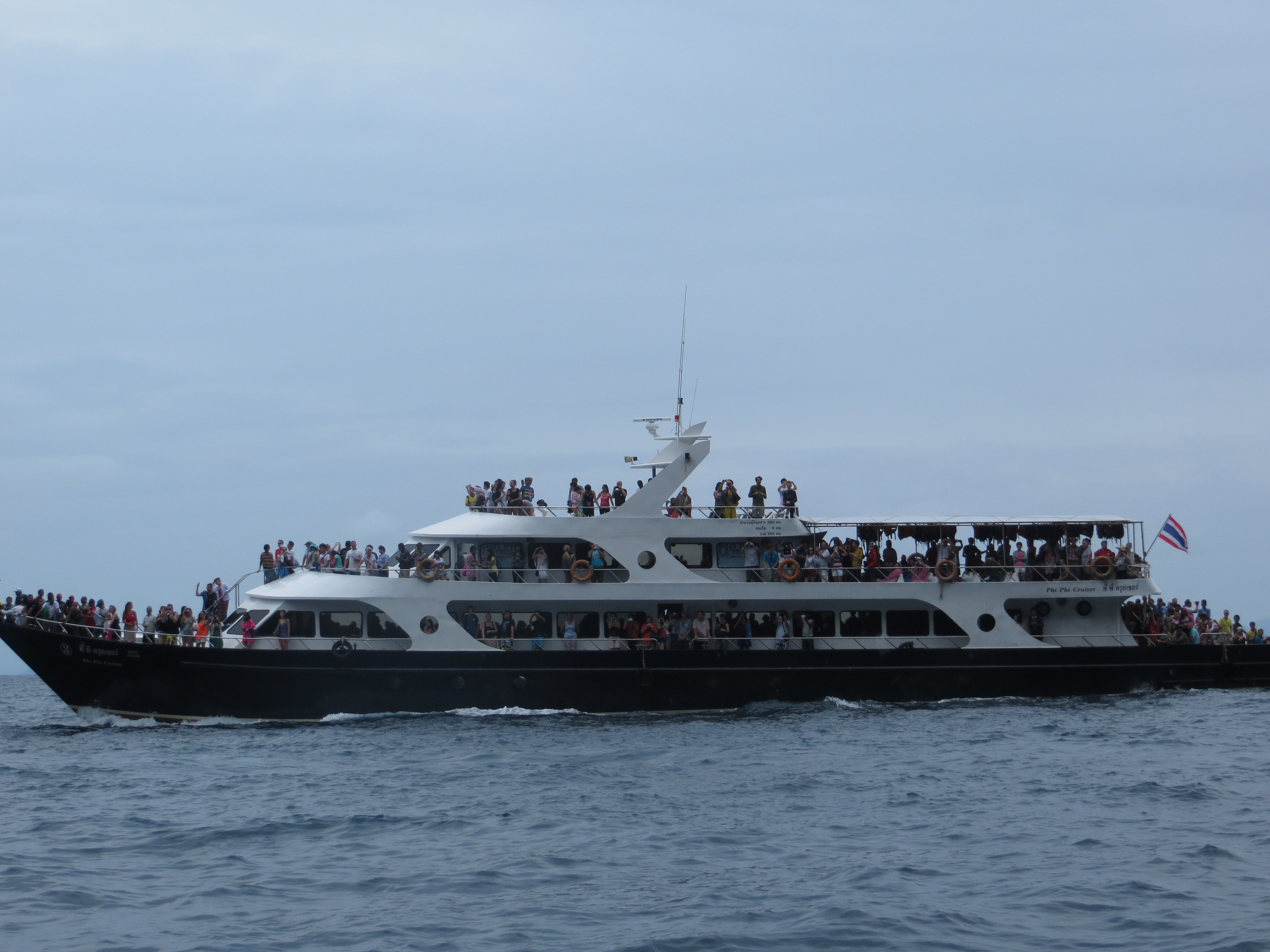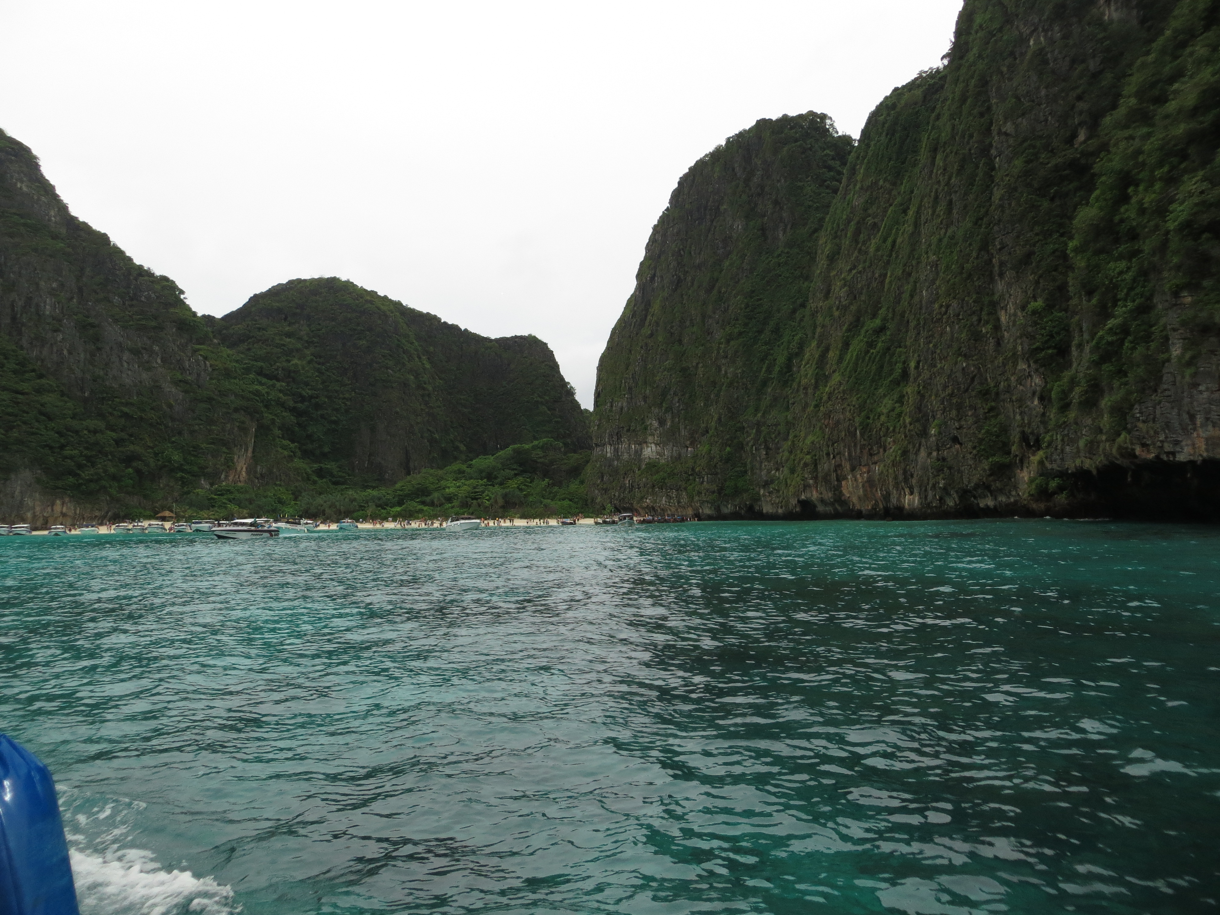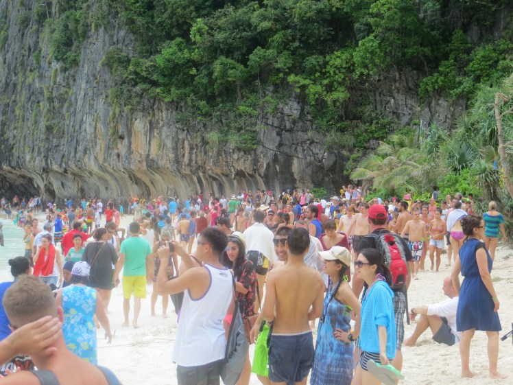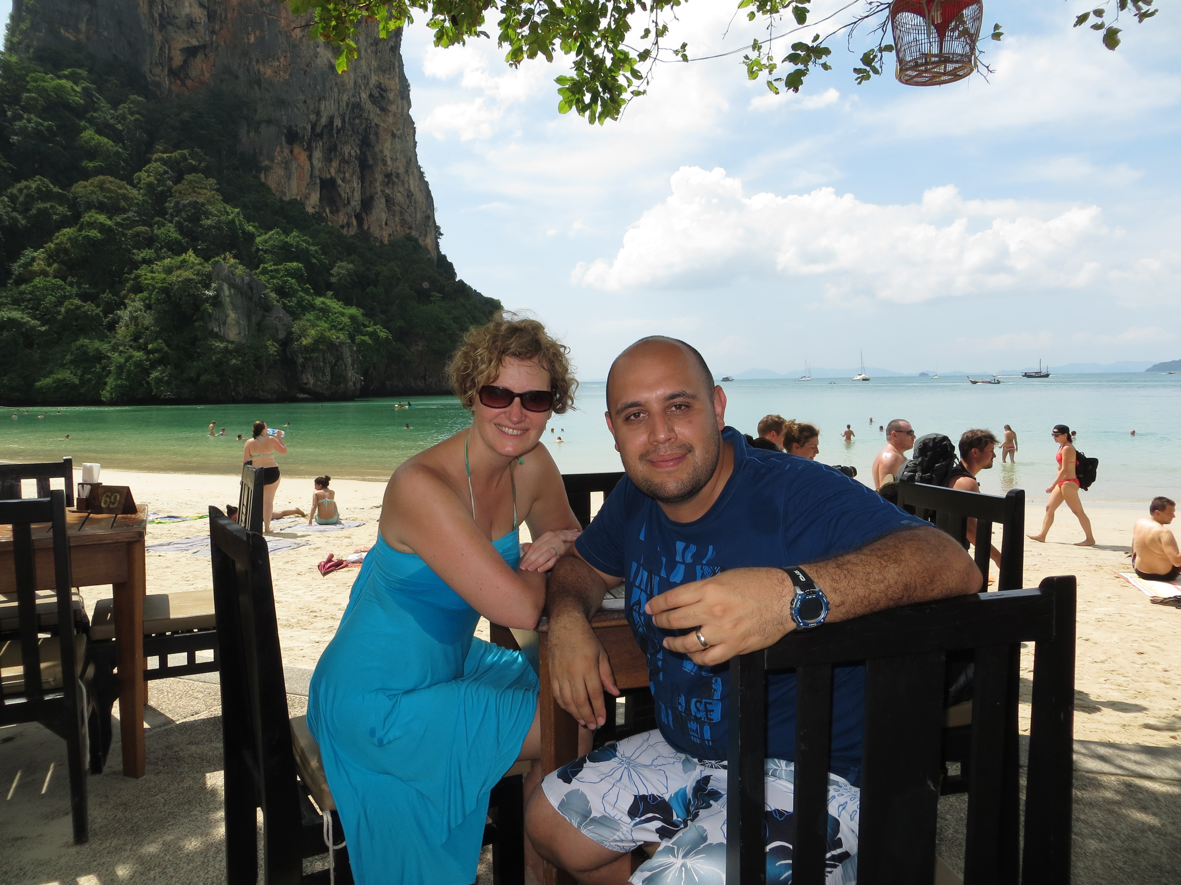 First lesson…clouds do not mean that it’s cold. It was a lovely temperature and we didn’t waste any time before we headed out exploring. Walking in the water at Nopparat Thara Beach people were collecting the live creatures that lived in shells that covered the ocean floor. Crunch. Crunch. It was impossible not to step on the poor little guys 😦We stayed at the Centara Anda Dhevi Resort. Perfect location. Close to the ferry terminal, the city centre and the beach. And they had the best Happy Hour from 5-7pm. We enjoyed the great live music, the delicious free snacks and the 2 for 1 drinks. We could not find a better Happy Hour and started our evenings there every night.We were actually fortunate to have one day with sun where we spent it at Rai Lei (Railay) Beach. We took a long-boat there for 400 Bhats return for the 2 of us. These long boats are definitely less stable than the ones in Myanmar. On these, the weight had to be evenly distributed and if anyone moved, it was a near topple-over.After swimming, tanning, walking to the other side of the peninsula, renting kayaks and touring around, it was time for a drink.Ahh, yes. This is the life.Walking the streets of Au Nang, Krabi, Thailand. It is a lovely town, although a bit westernized (can you say McDonald’s and Starbucks?).Au Nang still has its own charm and a definite Scandinavian influence. Many tourists from Scandinavia and Russia seem to favour this location. We did not meet one Canadian here which we found a bit surprising.They get points for the fancy presentation of my pineapple fried rice.Armando’s favourite chocolate bar is Kit-Kat so we couldn’t resist trying this impostor.Took an island-hopping trip one day. First stop…Ko Mai Phai (Bamboo Island).Next stop…Maya Beach on Ko Phi Phi Don Island. In the distance is the beach where Leonardo DiCaprio filmed the movie, “The Beach”.And this is the view up close. I guess every other tour boat had this stop as well. This is definitely not what the beach looked like in the brochure?!And look at some of the tour boats! Thank goodness we were on a small speed boat with maybe only 20 of us or so.Smile for the camera! Maya Beach. Check. Next stop….snorkelling.Feeding the fish. On the tour we stopped at a couple different places to snorkel. It was just amazing at how many fish there were. I guess the bread the tour guides kept throwing in the water helped.We could see fish at the surface but when you go underwater…wow! One of the most amazing things I saw that I never saw to this scale on past snorkelling adventures is the large schools of fish that swarmed from one direction to the next. Very cool.